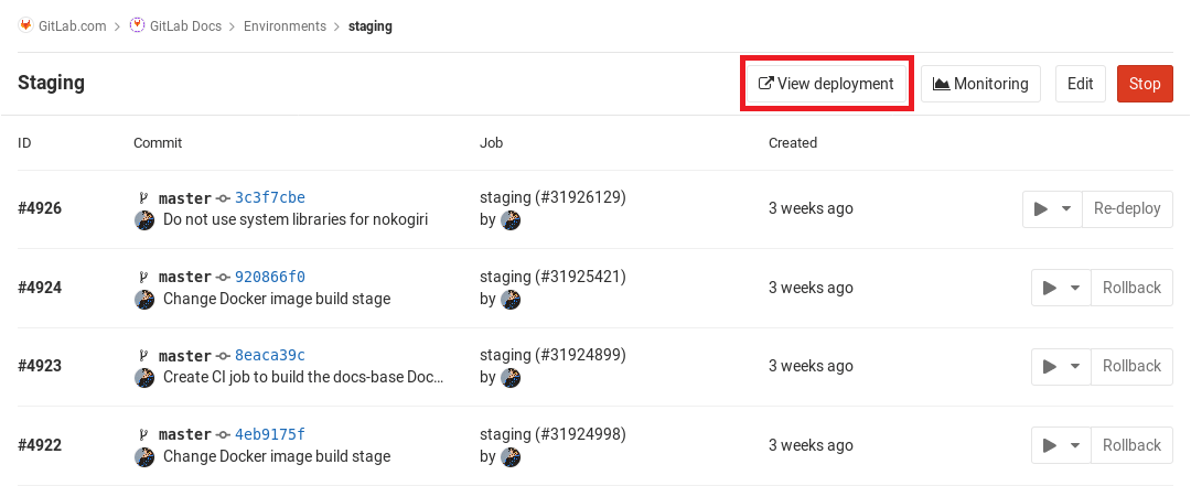 NOTE: Note: Since GitLab 9.2, all deployments to an environment are shown directly on the monitoring dashboard.