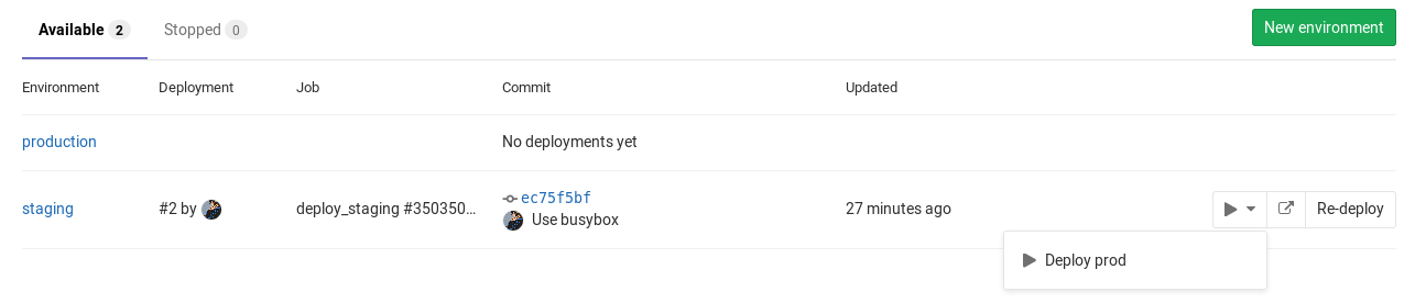 deploy_stagingjob will deploy our code to a staging server while the deployment will be recorded in an environment namedstaging.