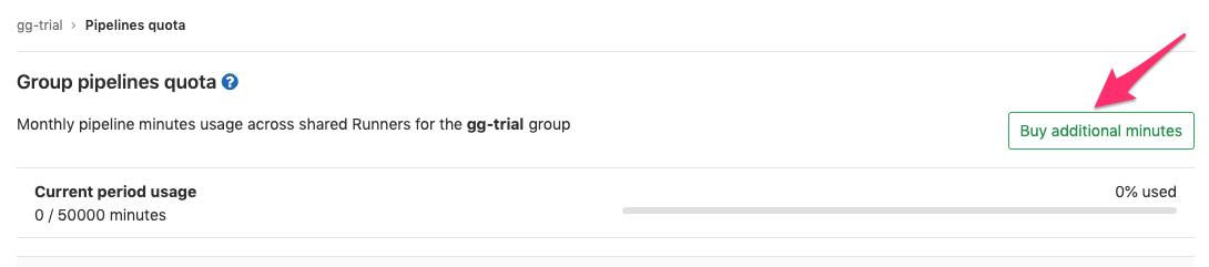 Once we have processed your payment, the extra CI minutes will be synced to your Group and you can visualize it from the Group > Settings > Pipelines quota page: