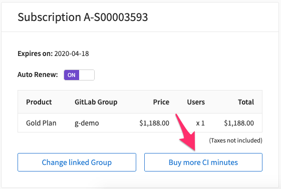 Locate the subscription card that is linked to your group on GitLab.com, click on Buy more CI minutes, and complete the details about the transaction.