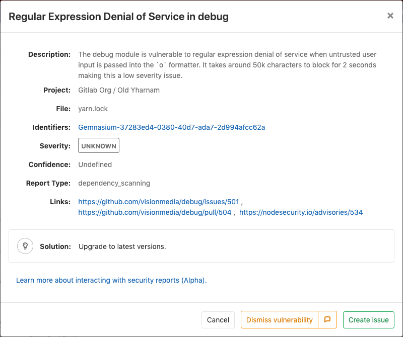Each security vulnerability in the merge request report or the Security Dashboard is actionable. Clicking on an entry, a detailed information will pop up with different possible options: