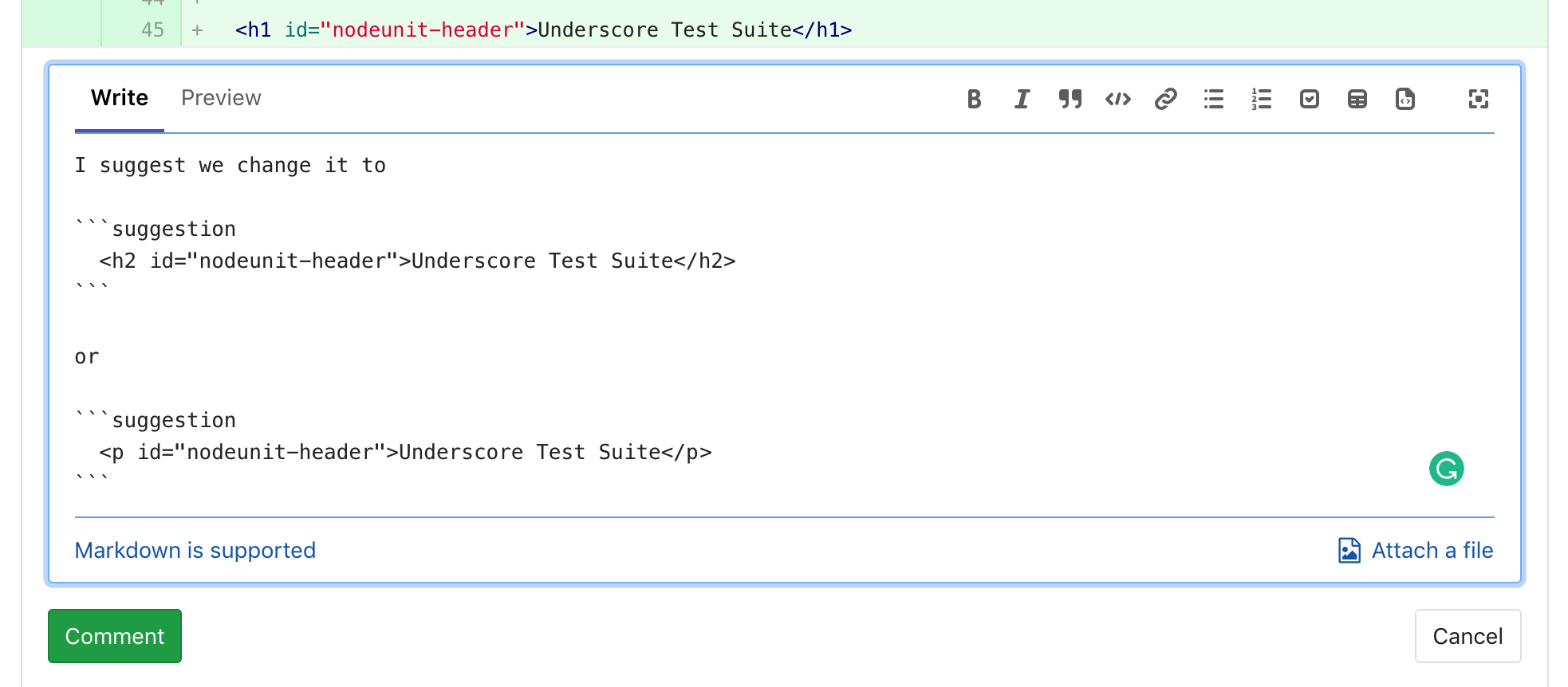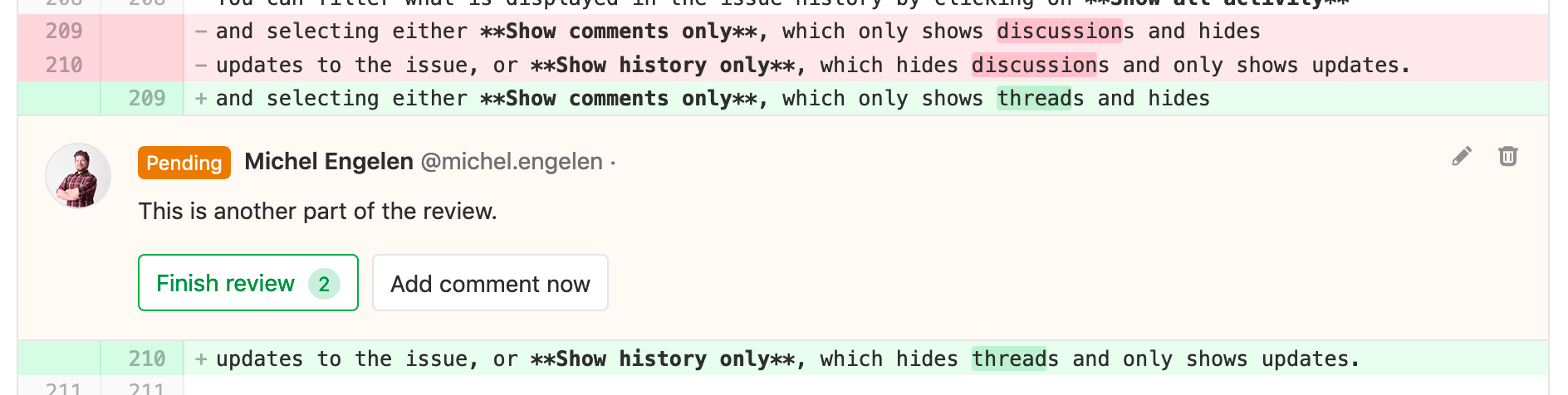 - Finish review: Submits all comments that are part of the review, making them visible to other users.