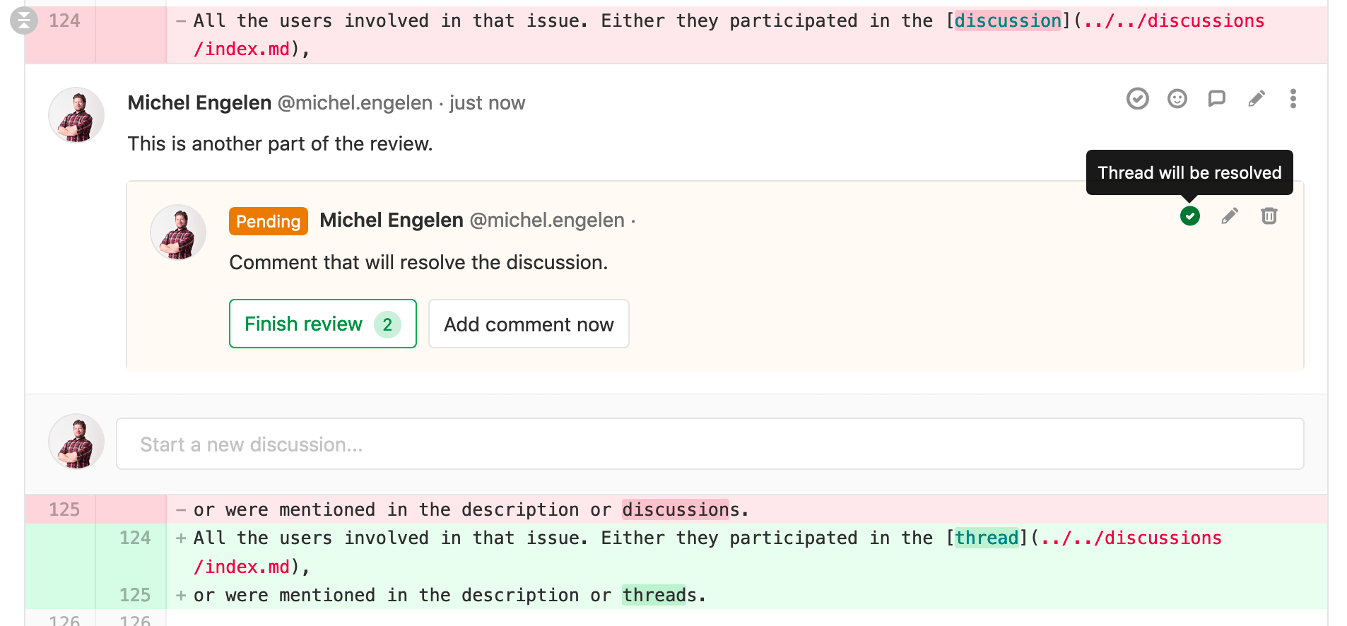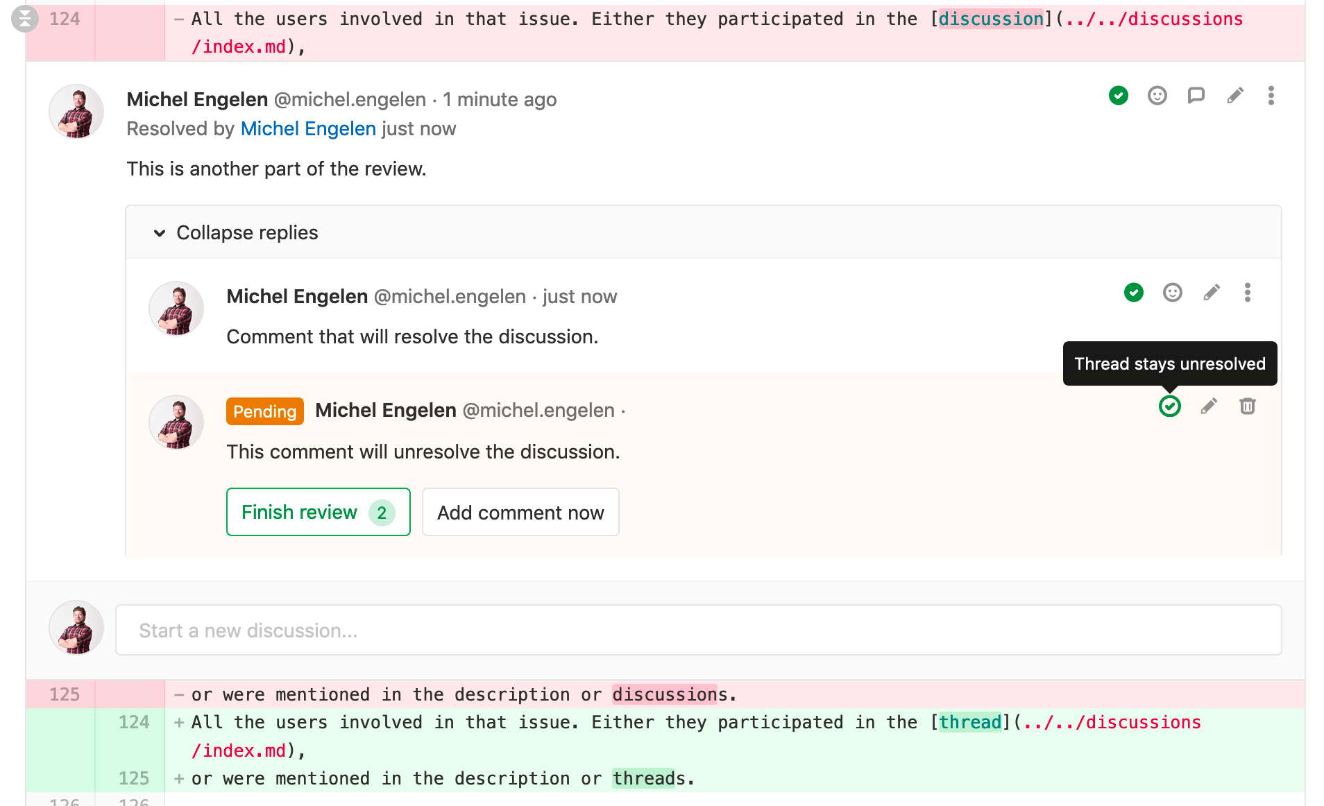 Every standard comment or thread in merge requests, commits, commit diffs, and snippets is initially displayed as unresolved. They can then be individually resolved by anyone with at least Developer access to the project or by the author of the change being reviewed. If the thread has been resolved and a non-member unresolves their own response, this will also unresolve the discussion thread. If the non-member then resolves this same response, this will resolve the discussion thread.