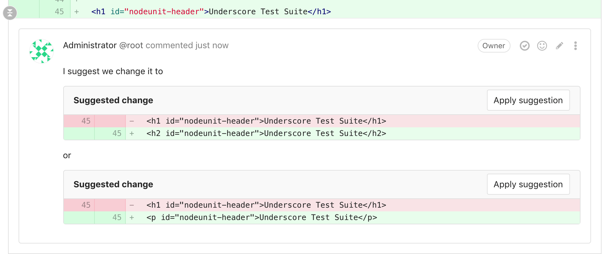 As a reviewer, you're able to suggest code changes with a simple markdown syntax in Merge Request Diff threads. Then, the Merge Request author (or other users with appropriate permission) is able to apply these suggestions with a click, which will generate a commit in the Merge Request authored by the user that applied them.