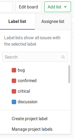 - Label list: a list based on a label. It shows all opened issues with that label.