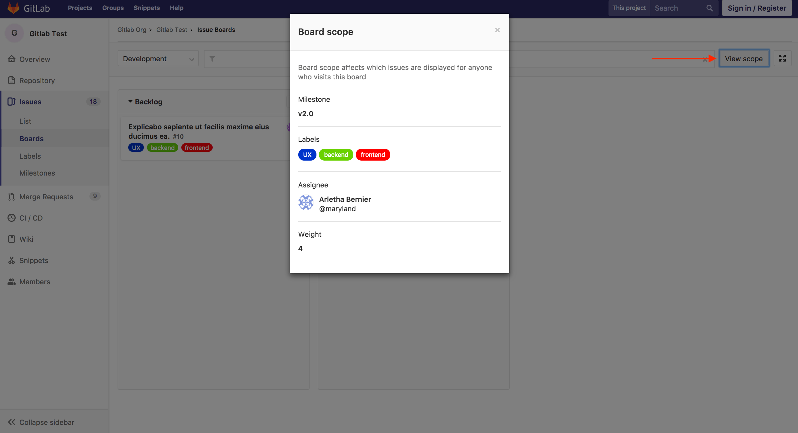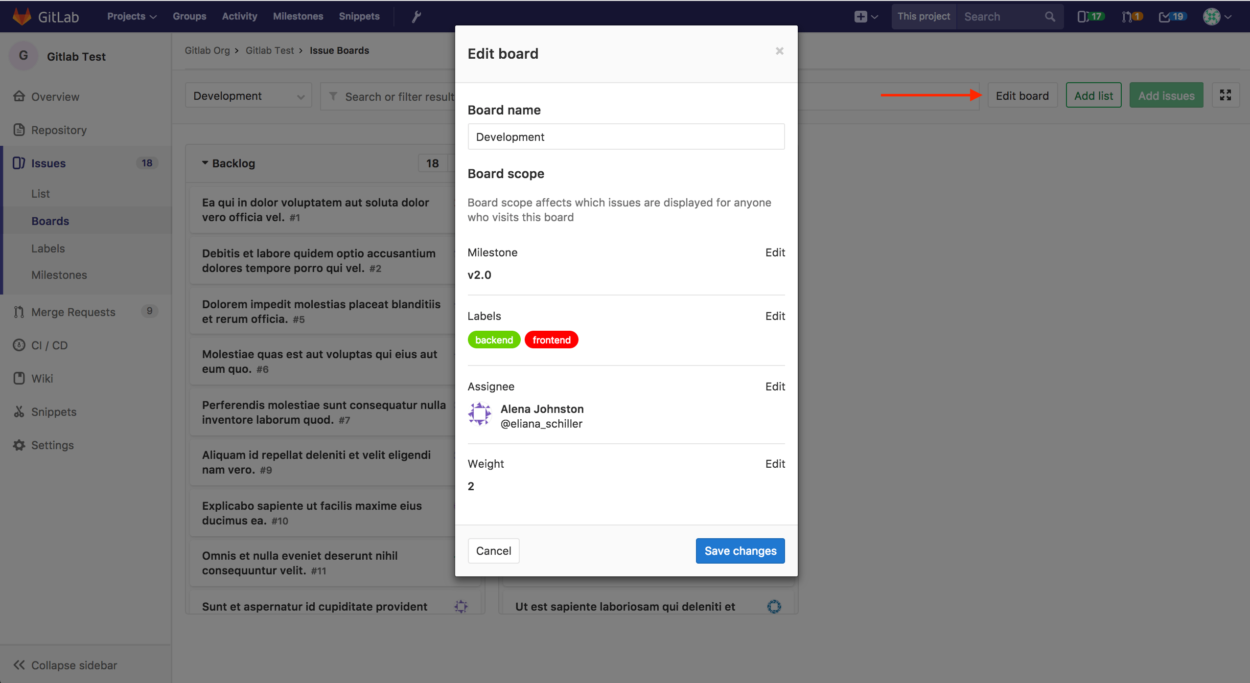 Accessible at the group navigation level, a group issue board offers the same features as a project-level board, but it can display issues from all projects in that group and its descendant subgroups. Similarly, you can only filter by group labels for these boards. When updating milestones and labels for an issue through the sidebar update mechanism, again only group-level objects are available.