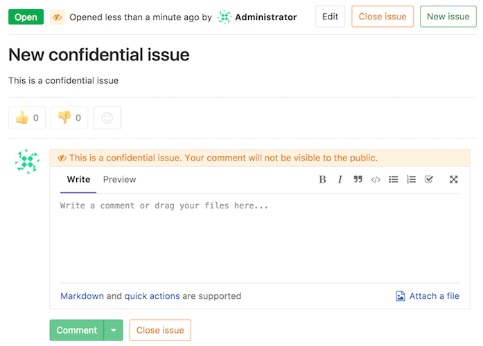 Likewise, while inside the issue, you can see the eye-slash icon right next to the issue number, but there is also an indicator in the comment area that the issue you are commenting on is confidential.