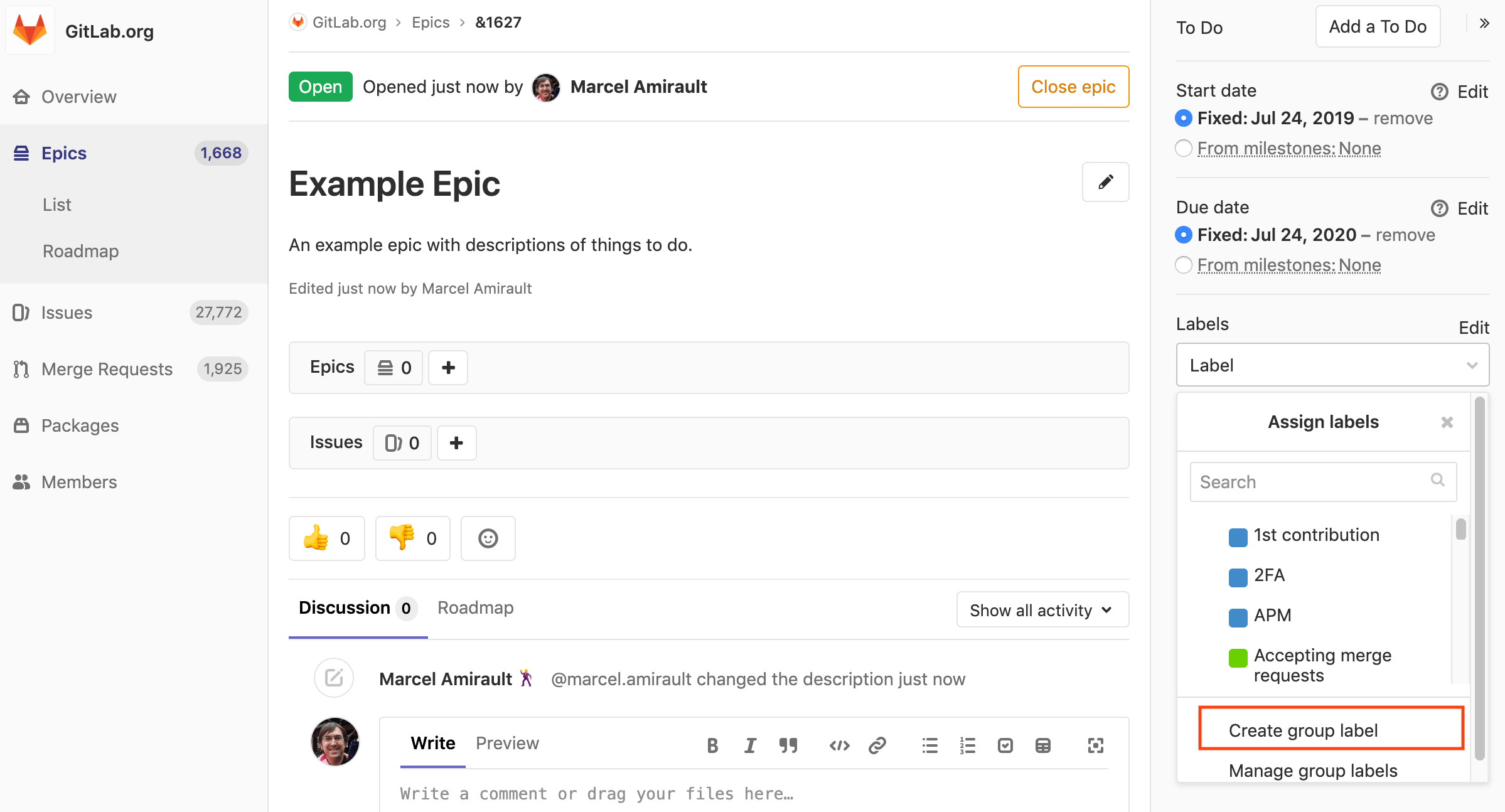 Alternatively, you can create group labels from the Epic sidebar. (ULTIMATE)