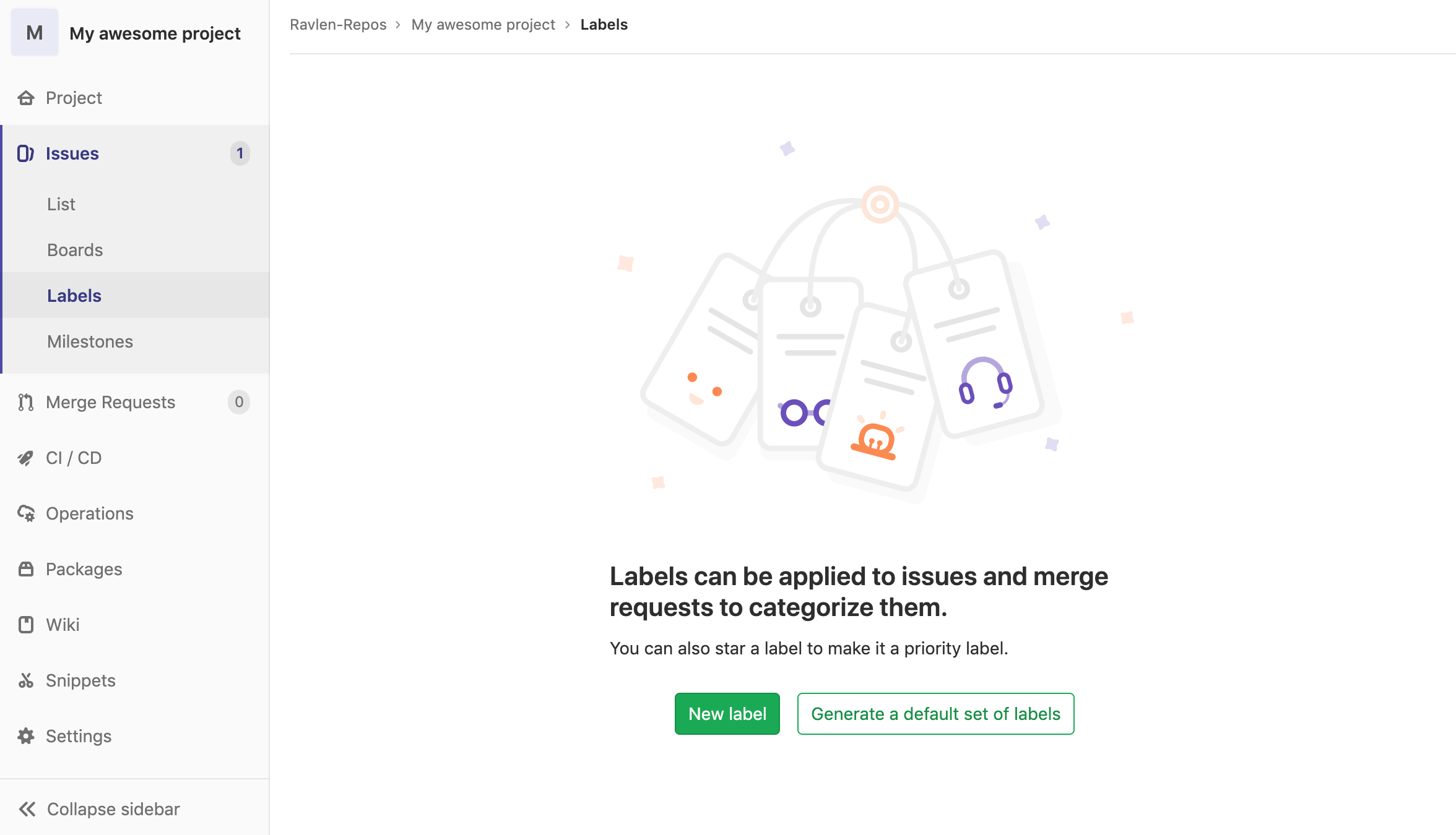 If a project has no labels, you can generate a default set of project labels from its empty label list page: