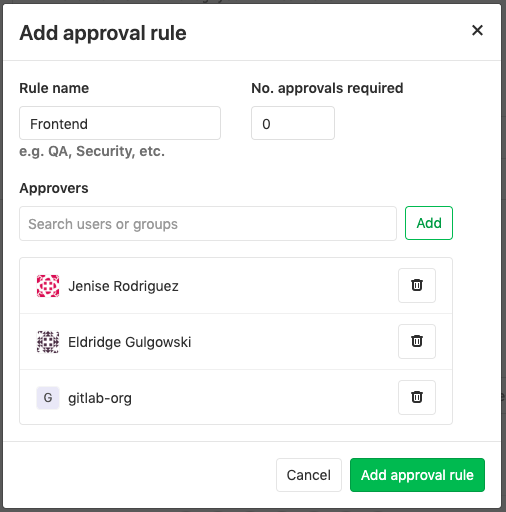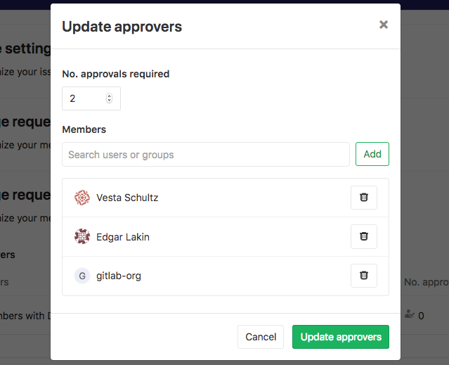 - Search for users or groups that will be eligible to approve merge requests and click the Add button to add them as approvers or remove existing approvers that were set in the project's settings.