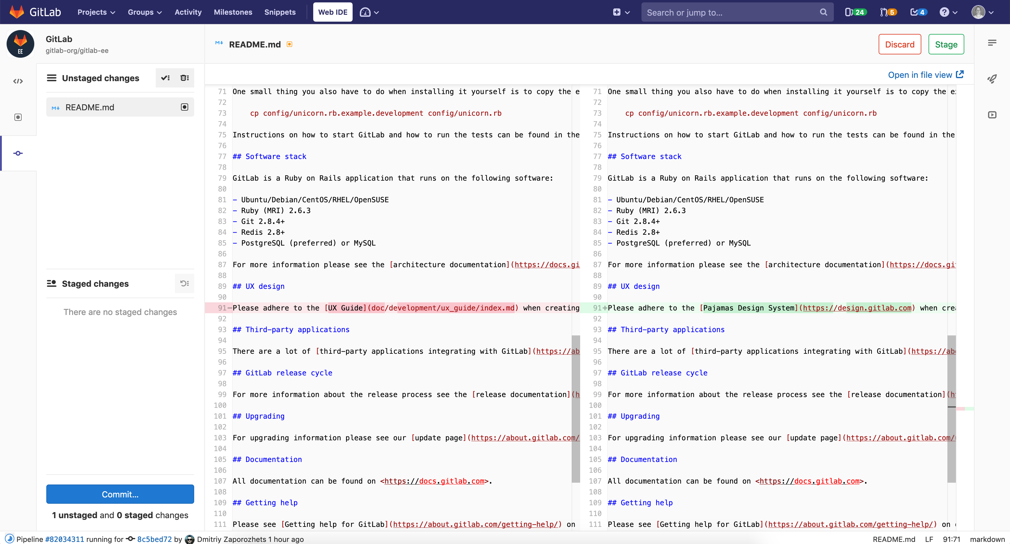 The Web IDE editor makes it faster and easier to contribute changes to your projects by providing an advanced editor with commit staging.