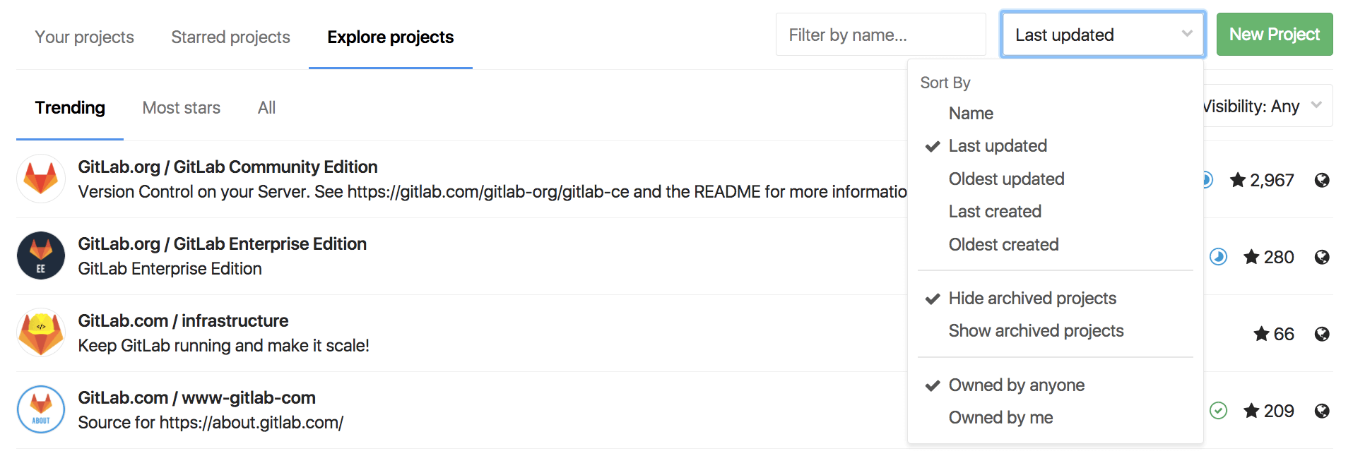 You can also look for the projects you starred (Starred projects), and Explore all public and internal projects available in GitLab.com, from which you can filter by visibility, through Trending, best rated with Most starts, or All of them.