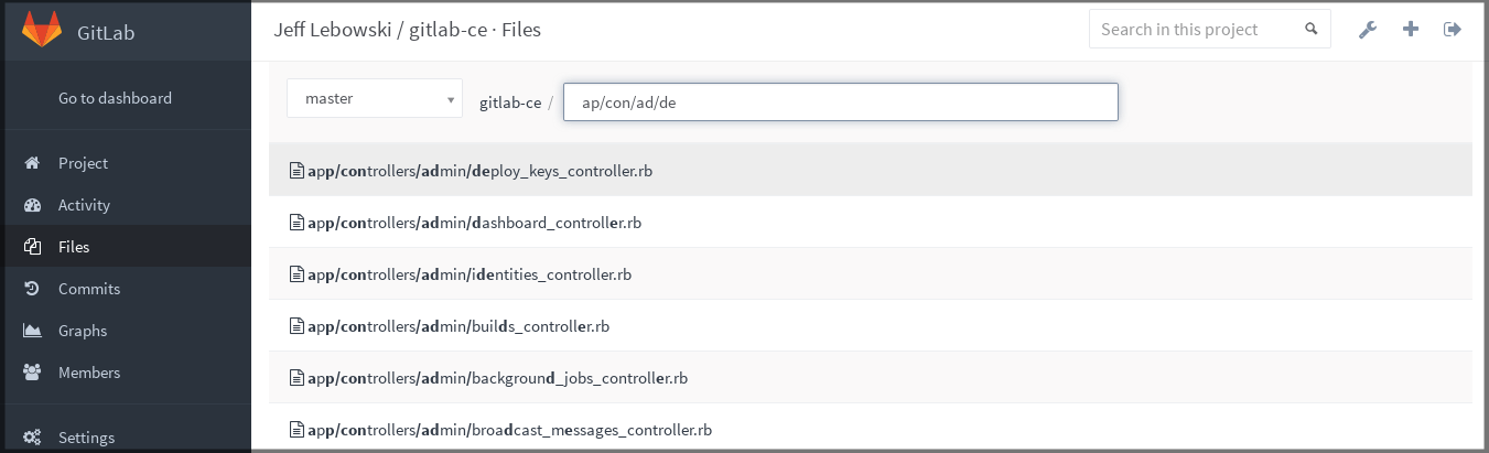 For example, consider the GitLab CE repository and that we want to open the app/controllers/admin/deploy_keys_controller.rb file.
